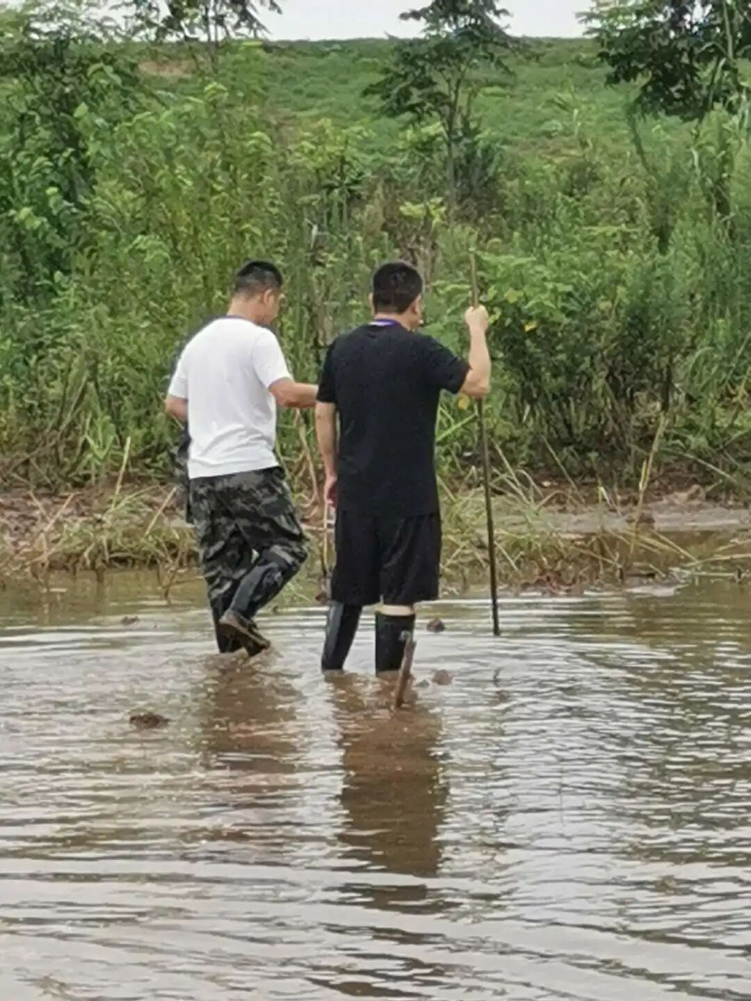 目前正值酷暑,晴天太阳晒,雨天一身泥。防守堤段还有被称为“土疯子”的剧毒蛇出没。每一次出去巡堤查险,巡堤人员都要全副武装穿上雨靴,穿上长衣长裤。晚上巡堤查险,每人也都是一手拿一盏手电灯,一手拿一根竹棍穿行在桑树林、杂草中。