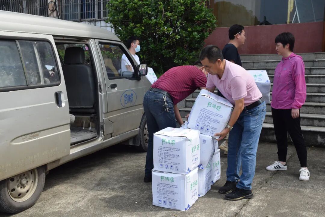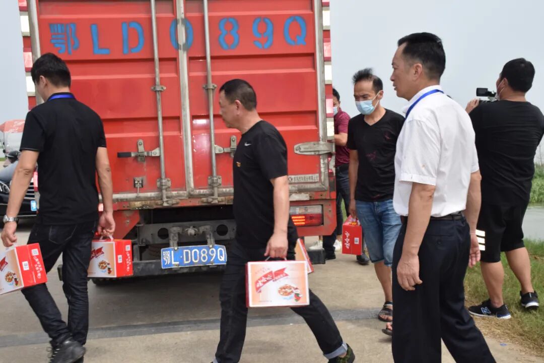 ▲爱心企业将慰问物资送至黄盖湖镇政府 活动中,碧清源山泉水饮品有限公司和赤壁百联商贸公司等新联会爱心会员企业为一线防汛工作人员送来价值2余万元的猪肉、矿泉水、八宝粥、方便面、杀虫剂等慰问物资;沧湖生态农业开发区向黄盖湖长江干堤防汛一线人员送来价值1万元的慰问物资。对他们夜以继日、不辞辛劳的战斗表示衷心的感谢,以实际行动为防汛抗灾贡献自己的一份力量。